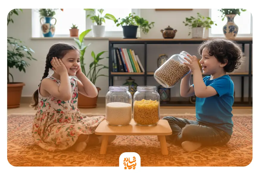 چند لیوان یا ظرف مختلف رو پر از مواد متفاوت مثل برنج، ماکارونی یا نخود کن. سپس یکی از اونها رو تکون بده و از کودک بخواه حدس بزنه صدای کدوم ظرف بود. این بازی شنیداری به تقویت دقت و حافظه شنیداری کودک کمک میکنه.